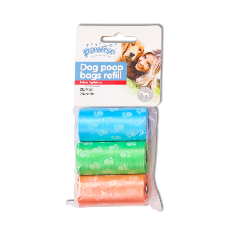 🌈♻ Pawise Bolsas Repuesto 3×20 Colores: tres rollos de 20 bolsas cada uno en colores surtidos, resistentes y a prueba de fugas. Compatibles con dispensadores Pawise —ideal para paseos cómodos y llenos de estilo. 🐾