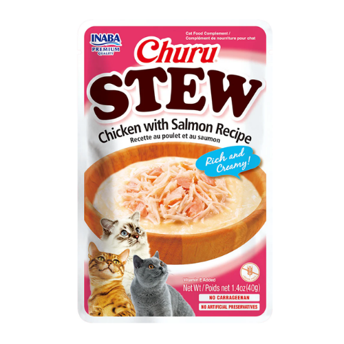 Lleva la experiencia de los snacks a otro nivel con el Churu Stew Pollo con Salmón 🐟🐔. Inspirado en un estofado casero, combina una textura cremosa y más densa que el Churu clásico, elaborada con pollo de granja y salmón salvaje.